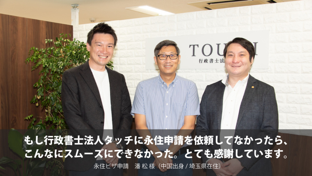 藩松様は行政書士法人タッチで帰化許可申請をおこない、2021年7月2日に許可されました。その後、奥様とお子様の永住申請を引き続き行政書士法人タッチに依頼され、2022年6月10日に永住許可が下りました。