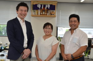 埼玉県でプラスティック加工業を経営されている小川様(写真右)は、創業時からの従業員で中国ご出身の陳様(写真中央)のビザ変更に際し、行政書士法人タッチに依頼されました。